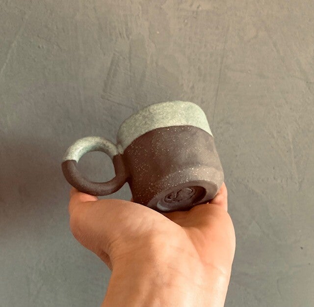 Tasse aus schwarzem Ton türkis glasiert.