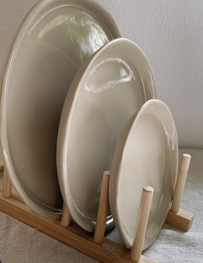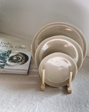 handgemachter Teller aus hellem Steinzeugton.